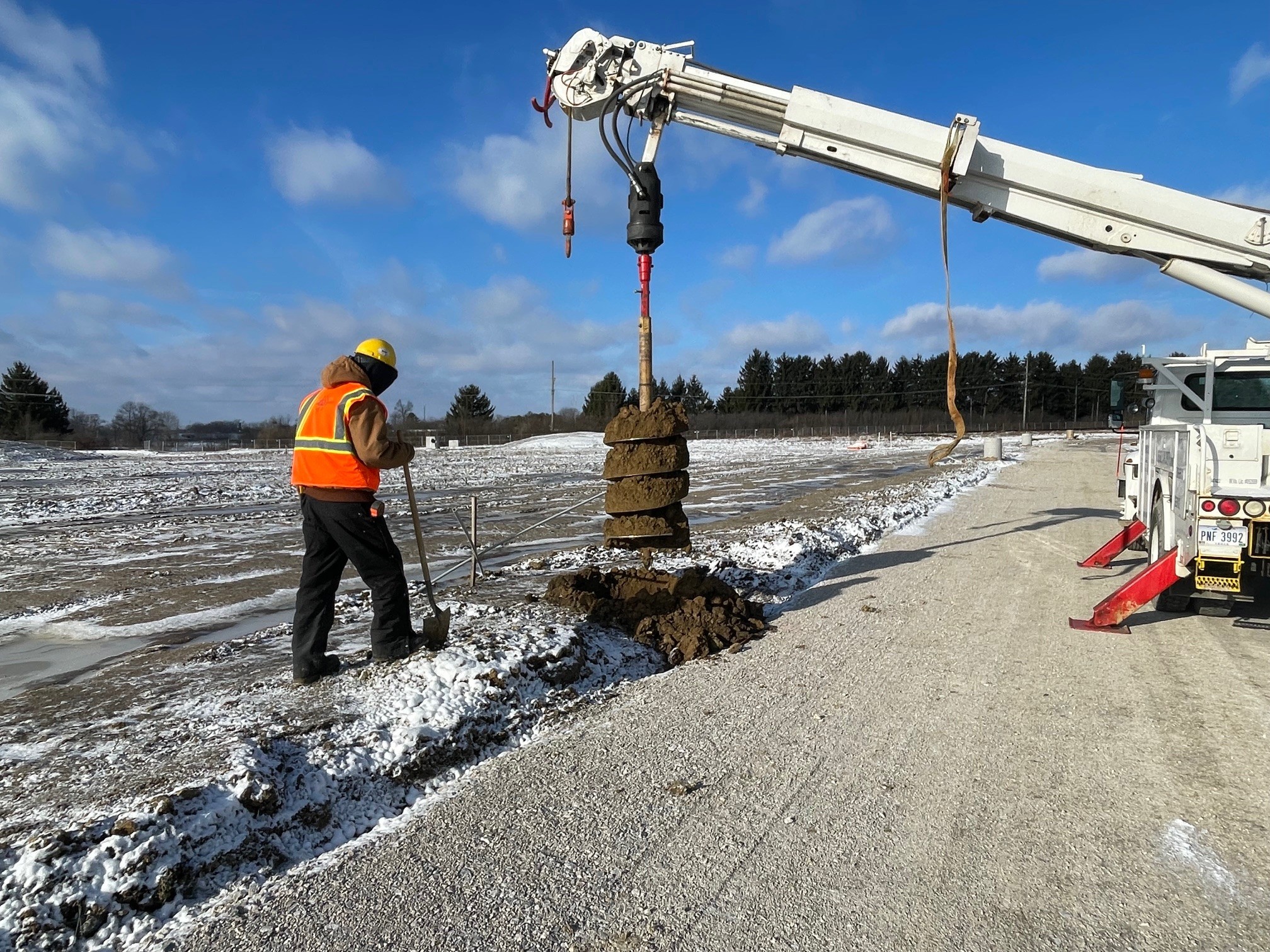 Electricians are handling the drilling themselves, as long as the ground conditions are favorable. The process includes prep and pouring concrete – even in winter weather.