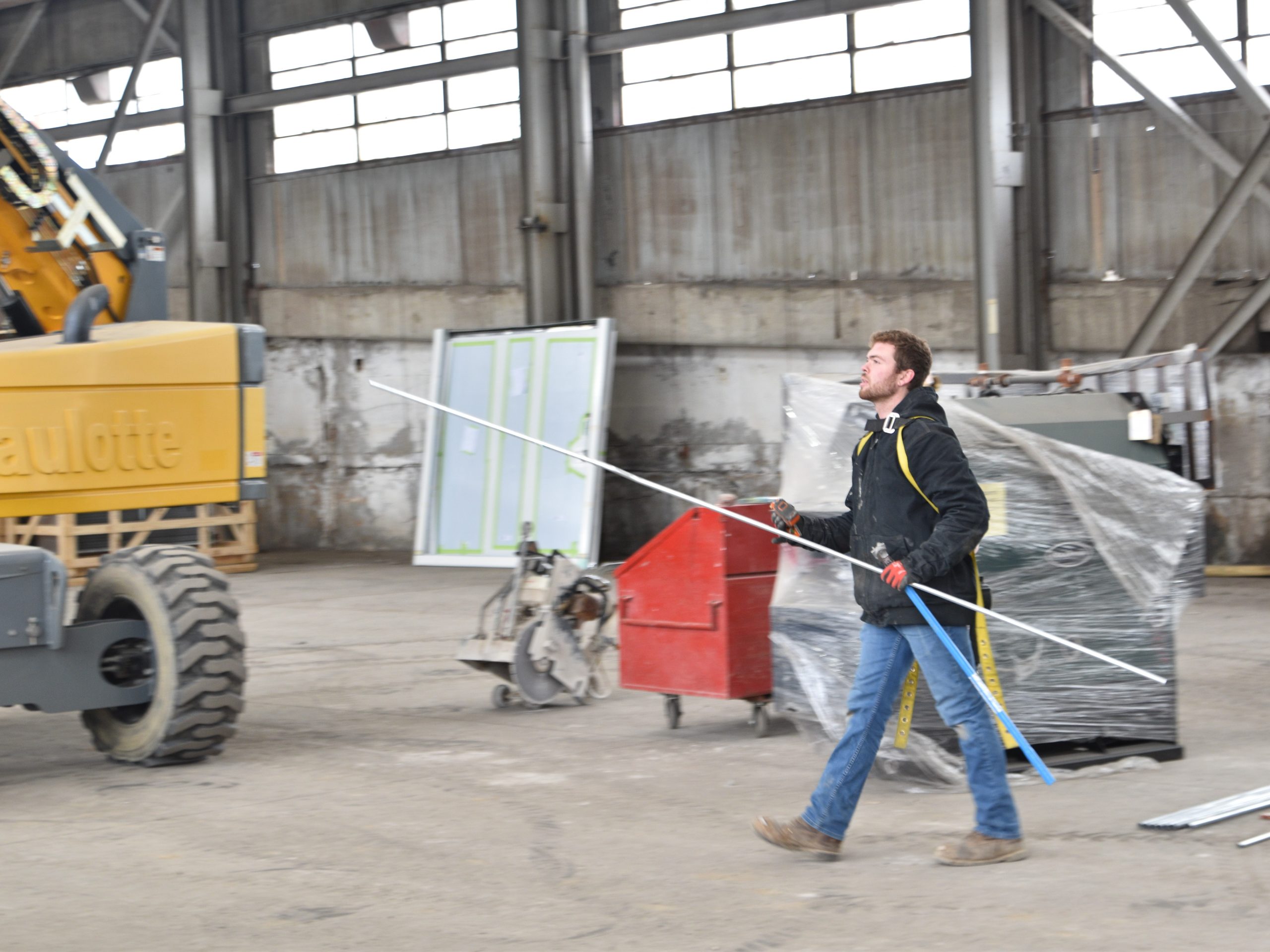 Some work King has performed includes bending conduit that MG Electric Journeyman electrician James Smith installs while working high-up on a lift.